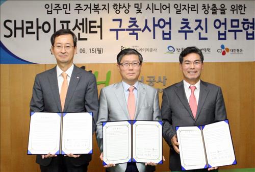 (서울=연합뉴스) 고유선 기자 = CJ대한통운은 에스에이치(SH)공사·한국노인인력개발원과 'SH라이프센터 구축사업 추진 업무협약(MOU)'을 맺었다고 15일 밝혔다.