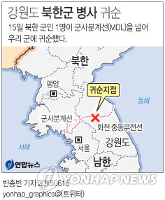 (서울=연합뉴스) 김귀근 이영재 기자 = 북한군 병사 1명이 15일 비무장지대(DMZ)에 있는 우리 군 소초(GP)를 통해 귀순했다.