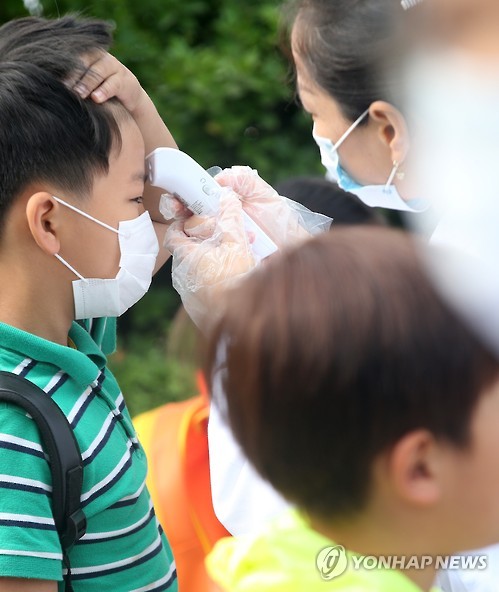 | △ 체온 측정하고 '등교' (평택=연합뉴스) 신영근 기자 = 중동호흡기증후군(메르스) 여파로 지난 12일까지 휴업했다 15일 오전 정상 수업을 재개한 경기도 평택의 한 초등학교 정문에서 학생들이 체온을 측정한 후 교실로 들어가고 있다. 2015.6.15 drops@yna.co.kr http://blog.yonhapnews.co.kr/geenang |