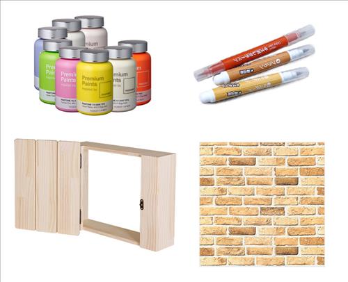 | △ 왼쪽 위부터 시계 방향으로 페인트, 흠집 보수 용품(스크레치 펜), 시트지, 스위치 커버. |