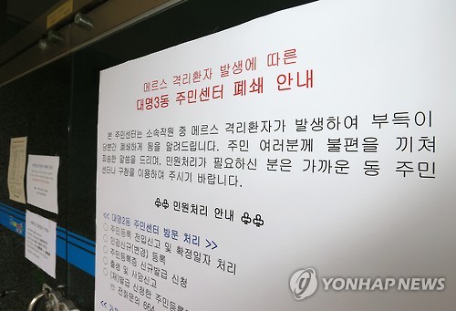 | △ 전 직원 격리조치 된 주민센터 (대구=연합뉴스) 김준범 기자 = 16일 오전 대구에서 중동호흡기증후군(메르스) 첫 확진 판정을 받은 A씨(52)가 근무한 대구 남구 대명3동 주민센터가 방역작업 후 폐쇄되고 있다. 대구시는 같은 공간에서 근무했던 남구청 직원 등 A씨와 접촉했던 50여명에 대해 자가격리 등 조처를 내렸다. 2015.6.16 psykims@yna.co.kr |