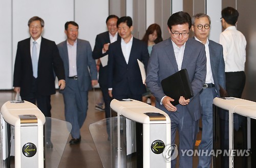 | △ 서초사옥 나서는 삼성그룹 사장단 (서울=연합뉴스) 임헌정 기자 = 김봉영 제일모직 리조트건설부문 대표이사 사장(오른쪽 세번째) 등 삼성그룹 사장단이 17일 서울 서초동 삼성전자 서초사옥에서 열린 삼성 사장단협의회에 참석한 뒤 건물을 나서고 있다. 2015.6.17 kane@yna.co.kr |