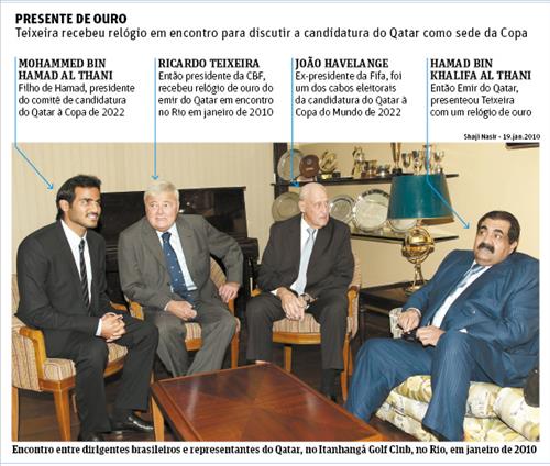 | △ 브라질 일간지 폴랴 지 상파울루에 실린 2010년 1월 당시 사진. 왼쪽 두번째부터 히카르두 테이셰이라 전 브라질축구협회 회장, 주앙 아벨란제 전 FIFA 명예회장, 하마드 빈 칼리파 알 타니 전 카타르 국왕. |