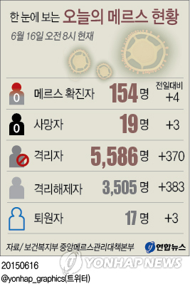 한편 전체 메르스 확진자 154명 가운데에는 병원을 내원했다 감염된 환자가 71명(46%)으로 가장 많았고, 환자 가족이나 방문객이 57명(37%), 의료진 등 병원 관련 종사자가 26명(17%)이었다.
