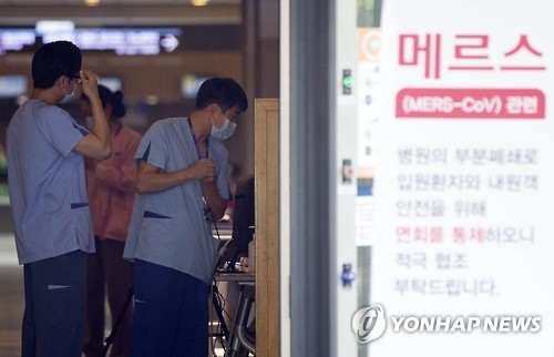 | △ '면회 통제합니다' (서울=연합뉴스) 윤동진 기자 = 16일 중동호흡기증후군(메르스) 확산 여파로 부분적인 병원 폐쇄조치가 내려진 강남구 삼성서울병원 로비에서 의료진이 업무를 보고 있다. 2015.6.16 mon@yna.co.kr |