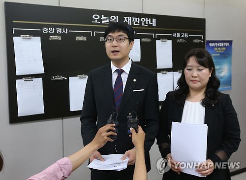 | △ 대한변협 대의원 100인 "변협 집행부 사법시험 존치 주장 반대" (서울=연합뉴스) 임헌정 기자 = 대한변호사협회 대의원 100인 대표 최익구, 임지영(왼쪽부터) 변호사가 17일 오후 서울 서초동 서울중앙지법 기자실에서 '대한변호사협회 집행부의 사법시험 존치 주장에 반대'하는 내용을 담은 성명을 발표하고 있다. 지난 1월 실시된 대한변협 대의원 선거에 출마해 당선한 선출직 대의원은 모두 347명이다. 2015.6.17 kane@yna.co.kr |
