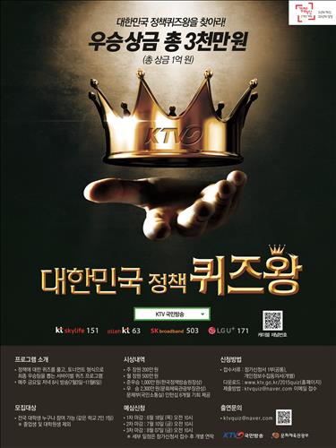 KTV(한국정책방송원)는 정부 정책에 대한 국민의 관심을 높이기 위해 서바이벌 퀴즈 프로그램 '대한민국 정책퀴즈왕'을 7월 3일부터 방송한다고 18일 밝혔다.