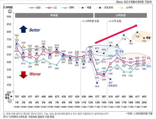 제품 만족도는 최근 6개월 안에 스마트폰을 구매한 소비자들이 해당 제품의 성능과 기능, 디자인을 1천 점 만점 기준으로 매긴 점수다.