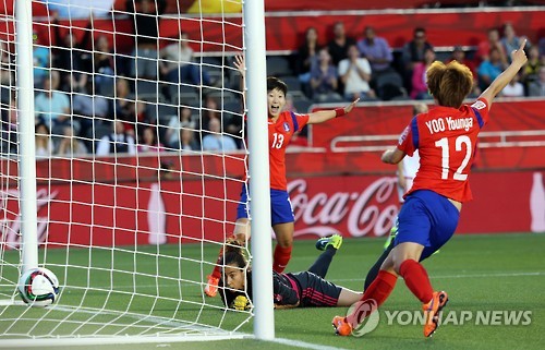 | △ 뜻하지 않은 역전골에 환호하는 선수들 (오타와=연합뉴스) 신준희 기자 = 18일 오전(한국시간) 캐나다 오타와 랜스다운 경기장에서 열린 2015 캐나다 여자 월드컵 조별리그 한국과 스페인의 경기. 한국 김수연이 올린 센터링이 골키퍼 키를 넘어 골문으로 들어가자 권하늘과 유영아가 환호하고 있다. 2015.6.18 hama@yna.co.kr |