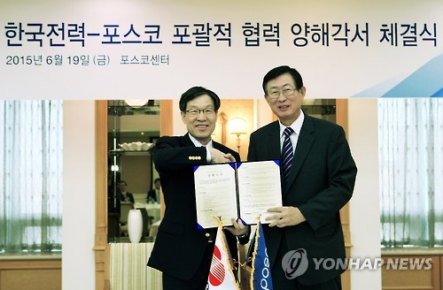 조환익 한국전력 사장과 권오준 포스코 회장은 19일 서울 대치동 포스코센터에서 이를 골자로 한 '포괄적 사업협력' 양해각서(MOU)에 서명했다.