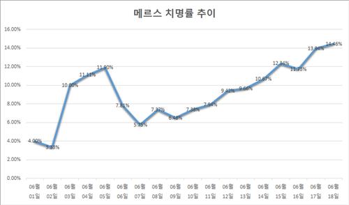 (세종=연합뉴스) 전명훈 기자 = 한 자릿수에 머물던 중동호흡기증후군(메르스)의 국내 치명률이 10%를 넘고서 상승세를 이어가고 있다. 중앙메르스관리대책본부는 이 수치가 더 상승할 가능성이 있다고 예상했다.