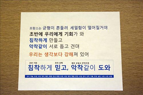 대표팀 관계자에 따르면 프랑스와의 2015 캐나다 여자 월드컵 16강전이 치러지는 22일(한국시간) 오전 대표팀 숙소 벽에는 '침착하게 믿고, 악착같이 도와'라고 쓰인 A4용지가 붙었다.