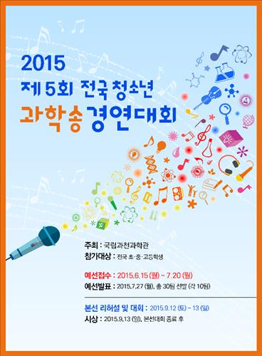 대회 참가 희망자는 내달 20일까지 참가신청서와 5분 이내의 발표용 동영상, 단체사진 2매를 대회 홈페이지(www.sciencesong2015.or.kr)에 내면 된다.