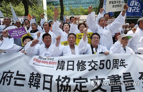 | △ 한일협정 보상내용 공개하라 (서울=연합뉴스) 한종찬 기자 = 한일수교 50주년을 맞은 22일 오전 서울 종로구 일본대사관 앞에서 아시아태평양전쟁희생자한국유족회 주최로 열린 한일협정 보상내용 공개촉구 기자회견에서 참가자들이 구호를 외치고 있다. 2015.6.22 saba@yna.co.kr |
