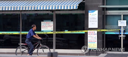 | △ 메르스로 은행업무도 일시 중지 (구리=연합뉴스) 노승혁 기자 = 유동인구가 많은 도심의 9층짜리 건물에 입주한 병원에서 중동호흡기증후군(메르스) 확진자가 나와 보건당국이 바짝 긴장하고 있다. 22일 메르스 확진자가 발생해 병원 건물 전체가 폐쇄된 경기도 구리시 카이저병원 1층 농협도 영업을 일시 중단했다. 한 시민이 안내문을 바라보고 있다. |