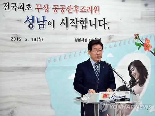 | △ (성남=연합뉴스) 이재명 성남시장은 16일 시청 한누리실에서 기자회견을 열고 무상 공공산후조리원 설치와 민간 산후조리비 이용료 등 산후조리비를 지원하는 내용의 '무상 공공산후조리 사업계획'을 발표했다. 2015.3.16 ≪성남시≫ |