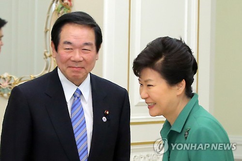| △ 박 대통령, 누카가 일한의원연맹 회장 접견 (서울=연합뉴스) 이정훈 기자 = 박근혜 대통령이 22일 오후 청와대를 방문한 누카가 후쿠시로 일한의원연맹 회장을 접견하기에 앞서 인사말을 나누고 있다. |