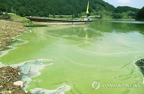 | △ 녹조 뒤덮인 2013년 여름의 대청호 <<연합뉴스 DB>> |