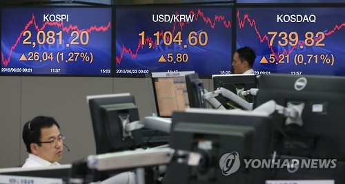 | △ 코스피·코스닥 동반상승 (서울=연합뉴스) 임헌정 기자 = 코스피가 기관의 매수에 힘입어 전날보다 26.04포인트(+1.27%) 오른 2,081.20에 장을 마친 23일 서울 중구 을지로 외환은행 본점 딜링룸에서 직원들이 업무를 하고 있다. 이날 코스닥은 전날보다 5.21(+0.71%) 오른 739.82에 장을 마감했다. |