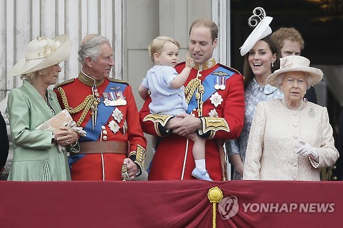 | △ Britain's Prince William holds his son Prince George, with Queen Elizabeth II, right, Kate, Duchess of Cambridge, the Prince of Wales and the Duchess of Cornwall during the Trooping The Colour parade at Buckingham Palace, in London, Saturday, June 13, 2015. Hundreds of soldiers in ceremonial dress have marched in London in the annual Trooping the Color parade to mark the official birthday of Queen Elizabeth II. The Trooping the Color tradition originates from preparations for battle, when flags were carried or "trooped" down the rank for soldiers to see. (AP Photo/Tim Ireland) |