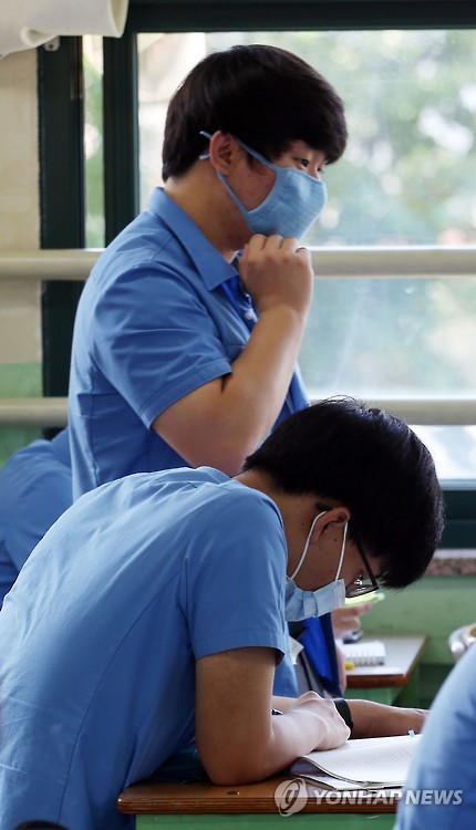 | △ '마스크 쓰고 시험준비' (서울=연합뉴스) 박동주 기자 = 대학수학능력시험 모의평가가 시행된 4일 오전 서울 종로구 경복고등학교에서 마스크를 쓴 학생이 시험을 준비하고 있다. 2015.6.4 pdj6635@yna.co.kr |