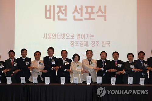 | △ K-ICT 사물인터넷 실증사업 착수보고회 (서울=연합뉴스) 24일 오후 경기도 성남시 분당구 글로벌R&D센터 대강당에서 열린 'K-ICT 사물인터넷 실증사업 착수보고회'에서 최재유 미래창조과학부 제2차관, 서병조 한국정보화진흥원장, 윤종록 정보통신산업진흥원장 등 참석자들이 비전선포식 세레모니를 하고 있다. (미래창조과학부 제공) |