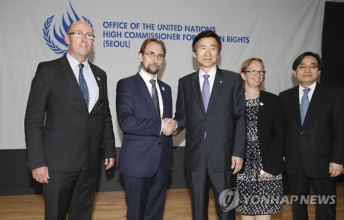 | △ 서울 유엔인권사무소 개소 (서울 사진공동취재단=연합뉴스) 북한의 인권 상황을 감시하는'유엔 북한인권사무소'(서울 유엔인권사무소) 개소식이 23일 오후 서울 종로구 글로벌센터에서 열려 참석자들이 기념촬영을 하고 있다. 왼쪽부터 로리 문거븐 유엔인권최고대표사무소 아시아 태평양 국장, 자이드 라아드 알 후세인 유엔 인권최고대표, 윤병세 외교부장관, 사인 폴슨 초대소장. 2015.6.23 photo@yna.co.kr |