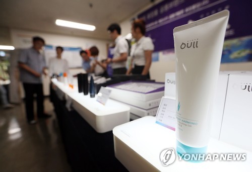 | △ 인천 공동브랜드 화장품 메르스 여파로 할인판매 (인천=연합뉴스) 윤태현 기자 = 25일 오후 인천시 남동구 인천시청에서 인천 공동브랜드 화장품인 '어울'이 저렴한 가격에 판매되고 있다. 시는 메르스 여파로 중국 관광객 방문이 취소돼 매출에 타격을 입은 지역 화장품기업을 보호하고자 '어울'을 공무원과 시민에게 30∼60% 저렴한 가격에 판매한다고 전했다. 2015.6.25 tomatoyoon@yna.co.kr |