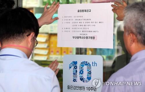 | △ (부산=연합뉴스) 조정호 기자 = 부산시는 중동호흡기증후군(메르스)에 감염된 143번 환자가 입원했던 부산 좋은강안병원의 2개 층을 외부와 차단하는 '코호트 격리'했다. 병원 직원이 수영구청에서 감염병 예방을 위해 병원 출입을 통제한다고 전달한 공고문을 출입문에 붙이고 있다. 2015.6.14 ccho@yna.co.kr(끝) |