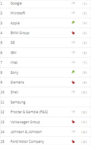 마이크로소프트와 애플은 각각 7,8위를 차지했고, 일본의 소니는 16위에 올랐다.