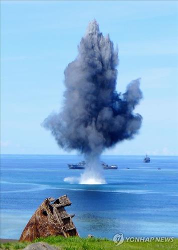 | △ 일본 해상자위대가 2015년 6월 24일 일본 도쿄에서 남쪽으로 약 1천200㎞ 떨어진 북태평양의 이오지마(硫黃島) 해상에서 벌인 기뢰제거 훈련에서 기뢰가 폭발하면서 물줄기와 연기가 솟구치고 있다. |