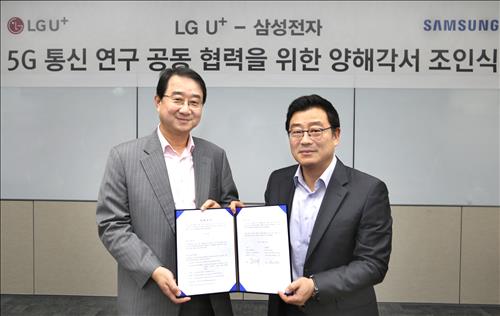 (서울=연합뉴스) 한지훈 기자 = LG유플러스[032640]는 25일 삼성전자[005930]와 5세대(5G) 통신 서비스의 핵심 기술을 개발하는 데 상호 협력하기로 하고 양해각서(MOU)를 체결했다.