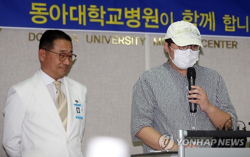 | △ 퇴원 메르스 143번 환자 "죄송합니다" (부산=연합뉴스) 김선호 기자 = 부산의 두 번째 중동호흡기증후군(메르스) 확진자이자 143번 환자인 이모(31)씨 25일 완치판정을 받고 퇴원하며 "시민에게 죄송하다"는 말을 하고 있다. 왼쪽은 김상범 병원장. 2015.6.25 wink@yna.co.kr |
