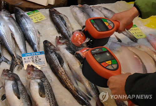 | △ 휴대용 방사능 측정기를 이용해 일본산 수산물에 대한 방사능 오염 여부를 검사하고 있다. (연합뉴스 자료사진) |