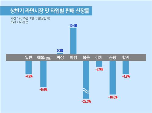 26일 업계와 시장조사기관 AC닐슨 등에 따르면 올해 1월부터 5월까지 전체 라면 시장 규모는 7천649억원으로 지난해 같은 기간보다 4.9% 감소했다.