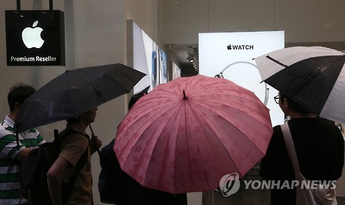 | △ 애플워치 사기 위해 빗속 대기 (서울=연합뉴스) 황광모 기자 = 애플이 출시한 '애플워치' 한국 판매 개시일인 26일 오전 서울 명동 애플 기기 판매점인 프리스비 앞에서 시민들이 줄지어 판매를 기다리고 있다. |