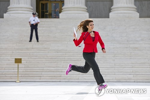 | △ Eliza Shirazi of Washington, a "college associate" with Fox Business, runs to report the Supreme Court opinions outside of the Supreme Court in Washington, Thursday June 25, 2015. The Supreme Court on Thursday upheld the nationwide tax subsidies under President Barack Obama's health care overhaul, in a ruling that preserves health insurance for millions of Americans. The justices said in a 6-3 ruling that the subsidies that 8.7 million people currently receive to make insurance affordable do not depend on where they live, under the 2010 health care law. (AP Photo/Jacquelyn Martin) |