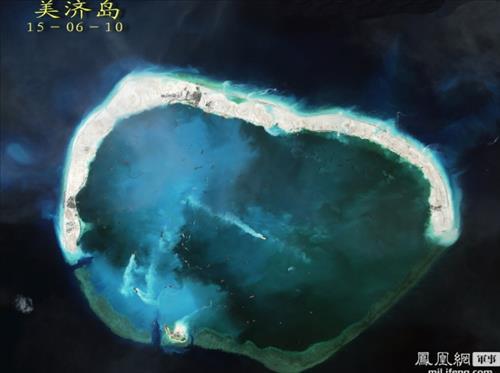 | △ '완성단계'에 있는 것으로 알려진 중국의 남중국해 인공섬 '미스치프 환초'(중국명 메이지자오(美濟礁)). <<홍콩 봉황망 캡처>> |