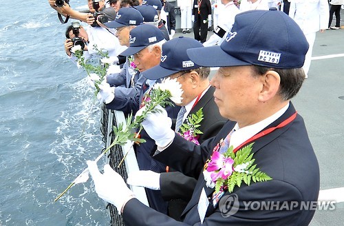 | △ 대한해협 해전 참전용사들의 해상헌화 (부산=연합뉴스) 제65주년 대한해협 해전 전승 기념행사가 열린 26일 부산 앞바다에서 당시 해전에 참전했던 용사들이 전몰용사를 추모하며 해상헌화를 하고 있다. 2015.6.26 <<해군작전사령부>> pitbull@yna.co.kr |