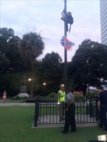 | △ 미국의 흑인 여성활동가 브리 뉴섬이 27일(현지시간) 오전 사우스캐롤라이나 주 의사당 앞마당의 깃대에 올라가 남부기를 들고 내려오고 있다. |