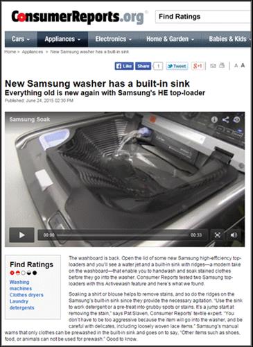 28일 컨슈머리포트(ConsumerReports.org)에 따르면 액티브워시의 빌트인 싱크에서 셔츠·블라우스를 불리고 애벌빨래를 하면 오염을 제거하는 데 큰 도움이 된다고 평했다. 모든 헌 것이 새롭게 탄생한다는 것이다.