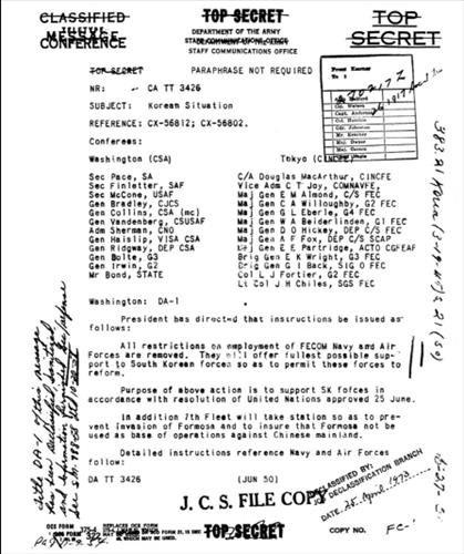 미국 국립문서기록관리청은 27일(현지시간) 한국전쟁 발발 65주년을 맞아 피터 페이스 육군성 장관이 트루먼 대통령의 무력사용 승인 결정을 더글러스 맥아더 극동사령관에게 전달하고 한국전쟁 상황에 대한 정보를 공유하는 내용이 담긴 일급비밀(Top Secret) 전문을 자체 웹사이트에 게재했다.