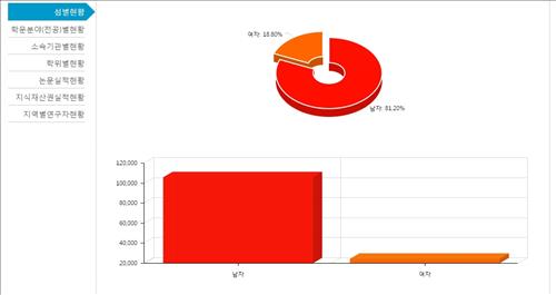 연구인력의 소속 기관별로는 대학교가 5만6천316명(43.15%)으로 비중이 가장 컸으며 기업은 4만2천933명(32.9%), 연구소 8천554명(6.55%)으로 파악됐다.