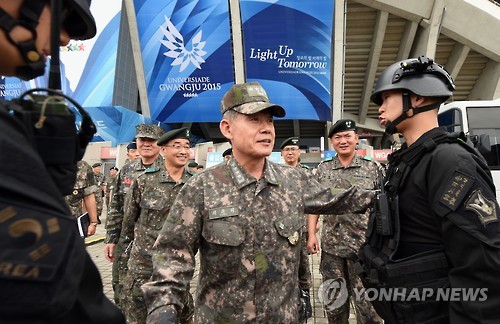 (서울=연합뉴스) 이영재 기자 = 최윤희 합참의장이 29일 2015 하계유니버시아드대회(U대회)가 열릴 광주 월드컵경기장을 방문해 북한의 도발 가능성에 대한 만반의 대비 태세를 강조했다고 합참이 밝혔다.