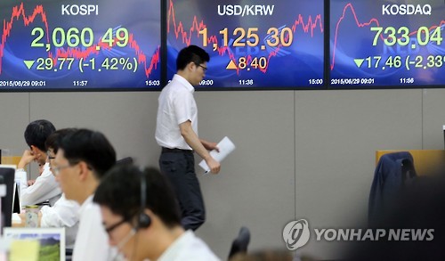 (서울=연합뉴스) 임수정 기자 = 그리스가 채무불이행(디폴트)에 한발짝 더 다가섰다는 관측에 국내 증시가 29일 급락세를 보이며 출렁였다.