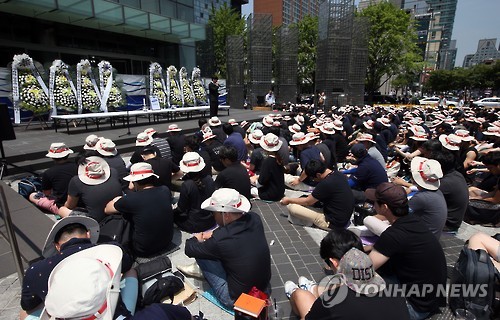 | △ 삼성사옥 앞 삼성테크윈 노조원들 (서울=연합뉴스) 박동주 기자 = 삼성그룹의 삼성테크윈 한화 매각을 반대하는 삼성테크윈 노동조합원들이 29일 오전 서울 서초구 삼성사옥 앞에서 집회를 하고 있다. pdj6635@yna.co.kr |