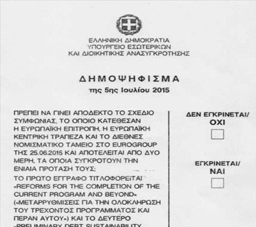 용지의 오른쪽에는 '오히'(OXI, 아니다의 그리스어)를 선택하는 칸이 위에 있고 '네'(NAI, 그렇다)는 아래 쪽에 있다.