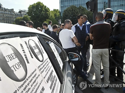 | △ '우버' 때문에 못 살겠어요 (파리 AP=연합뉴스) 25일(현지시간) 프랑스 파리에서 세계 최대 차량 공유서비스 '우버'에 항의해 파업 시위를 벌이는 택시 기사들이 폭동진압 경찰과 대화하고 있다. 택시 창문에 '불법 우버 운행 중단시키라'는 글귀의 포스터가 붙어 있다. 우버에 반대하는 기사들의 시위는 이날 프랑스 전역에서 열렸다. |