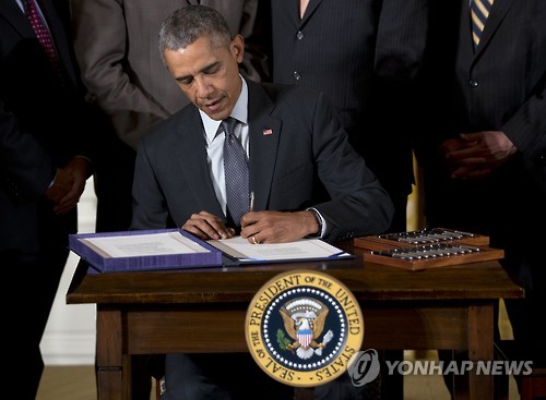 (워싱턴=연합뉴스) 김세진 특파원 = 버락 오바마 미국 대통령은 29일(현지시간) 무역협상촉진권한(TPA) 부여 법안과 무역조정지원제도(TAA) 법안에 서명했다.