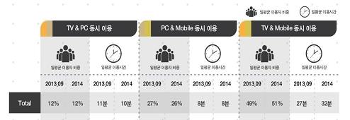 TV와 모바일을 동시에 이용한다고 답한 응답자는 51%, 이들의 하루 평균 이용시간은 32분이었다.